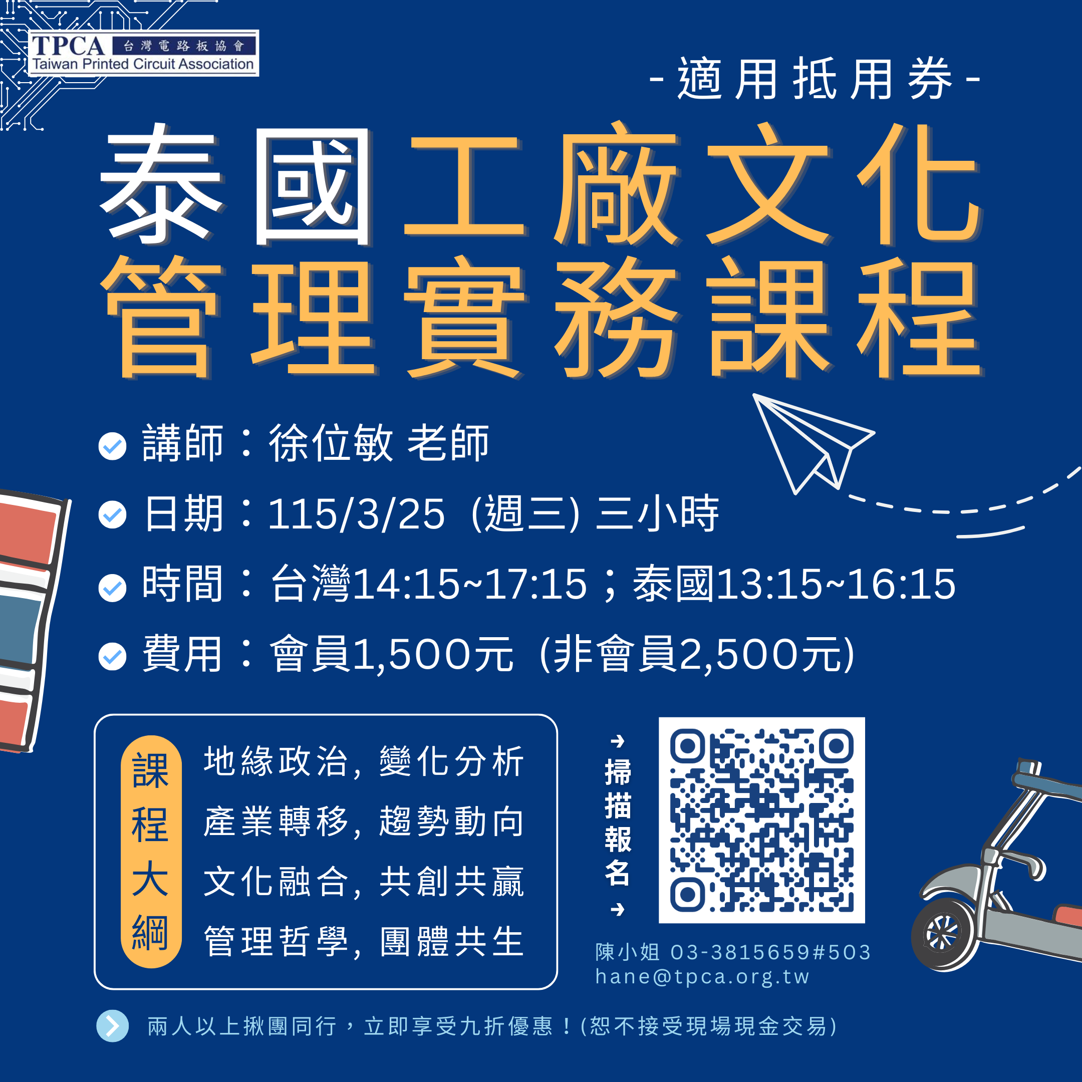 報名/繳費相關:唐小姐 (T) 03-3815659#508 (E) training@tpca.org.tw