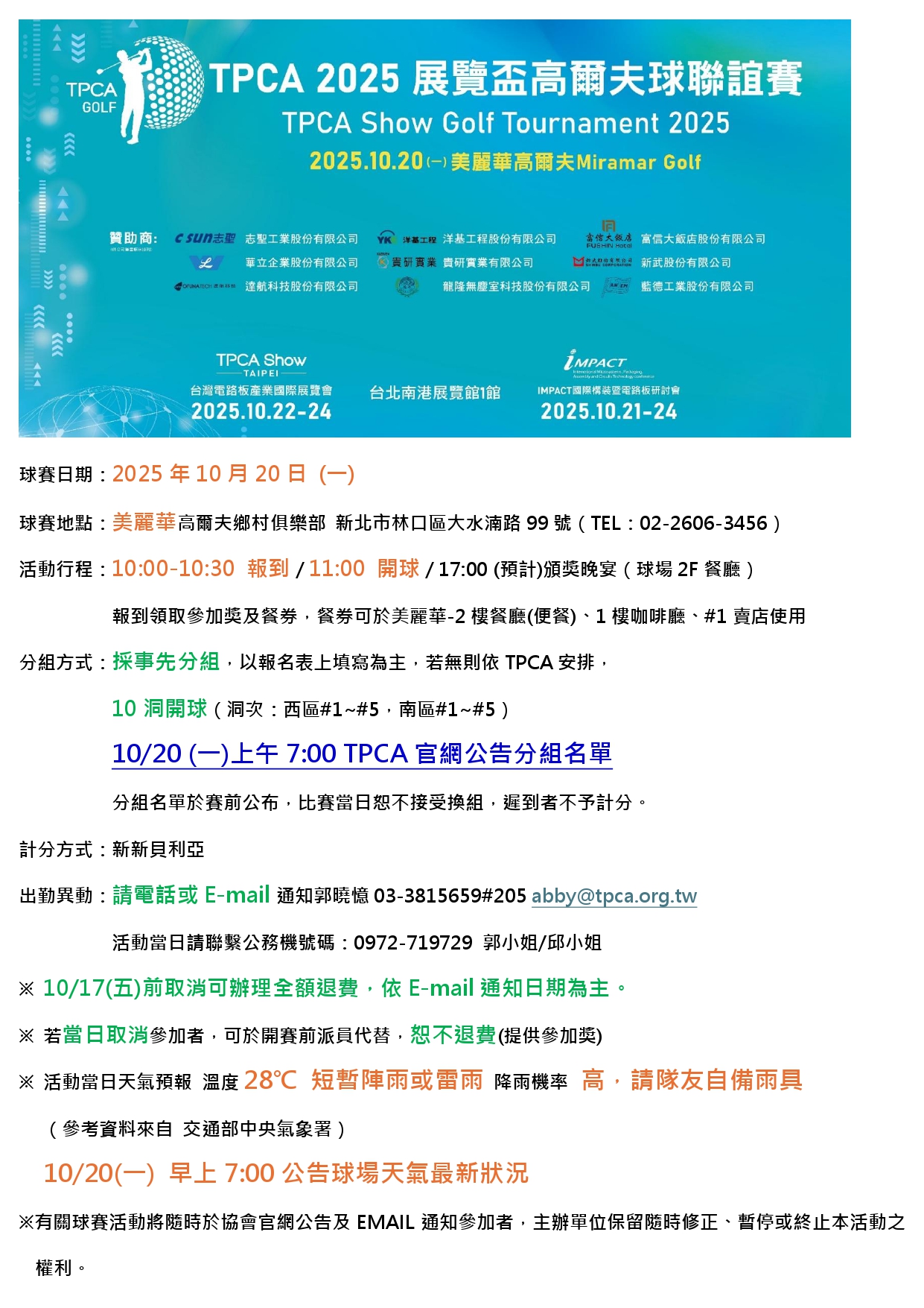 【10/20】TPCA 2025展覽盃高爾夫球聯誼賽~取消通知~