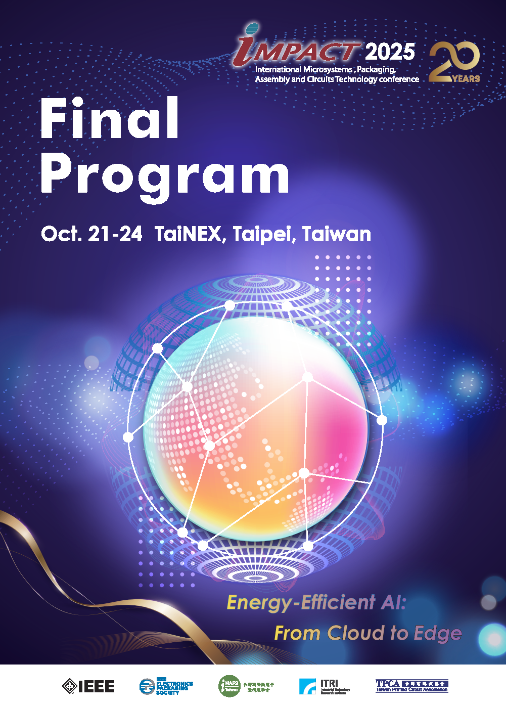 第20屆國際構裝暨電路板研討會( 簡稱IMPACT 研討會),於2025年10月21日 (二) 到10月24日(五)在台北南港展覽館盛大展開, 由IEEE EPS-Taipei、iMAPS-Taiwan、ITRI及TPCA共同主辦,為亞洲最大橫跨電路板、半導體與封裝測試的國際盛會。這場邁入二十週年的重量級國際研討會,今年以主題「Energy-Efficient AI: From Cloud to Edge」聚焦能源高效的AI應用,規劃45場專題演講,邀請多位國際領袖級專家分享最新研究成果與產業趨勢,吸引超過千位全球半導體封裝與電路板領域的專家齊聚,共同探討AI時代的創新技術與永續發展方向。